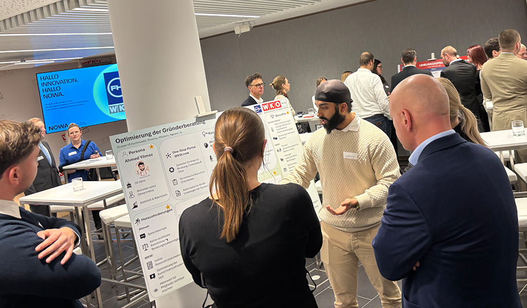 The results focused on use cases and concepts for the future WKW.now app based on personas. The posters showed how the app could complement the Vienna Chamber of Commerce’s range of services in the future, for example through intelligent matching approaches that connect members with suitable services and consulting offers or even with potential apprentices. Paul Frühwirth particularly emphasized the commitment and creativity of the students. He said he “really liked the students’ commitment” and that the posters were “characterized by many different ideas.” From a practical perspective, the relevance was clearly evident: Christopher Kalenda emphasized that “the projects presented were thematically very relevant” and that “the quality of the elaboration and the creative and structured design of the solutions were very convincing overall.”