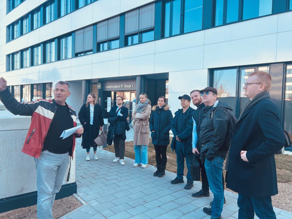 The project is being implemented by Strabag Real Estate. Project manager Christian Kerth gave the students a tour of the construction site and provided an overview of the planning, implementation and goals of this modern and sustainable neighborhood development.