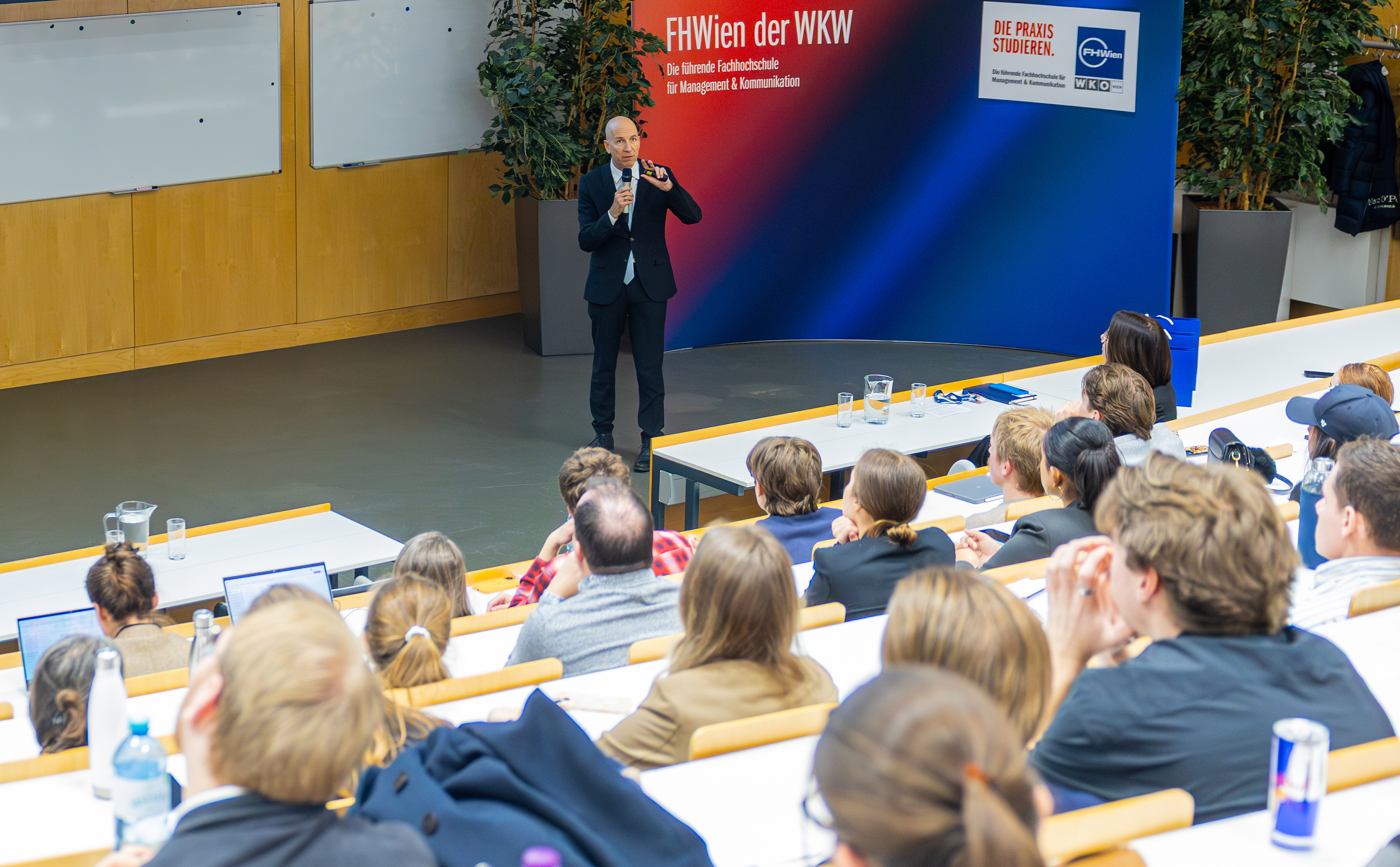 National Bank Governor Martin Kocher delivering his keynote on monetary policy in a changing world in FHWien der WKW’s main lecture hall.