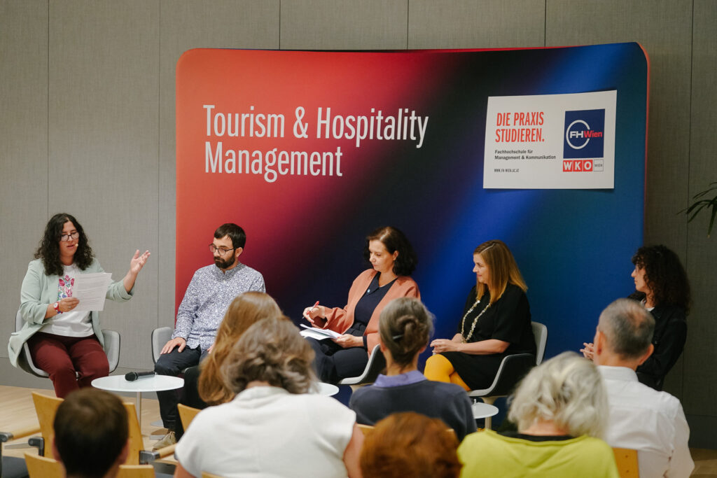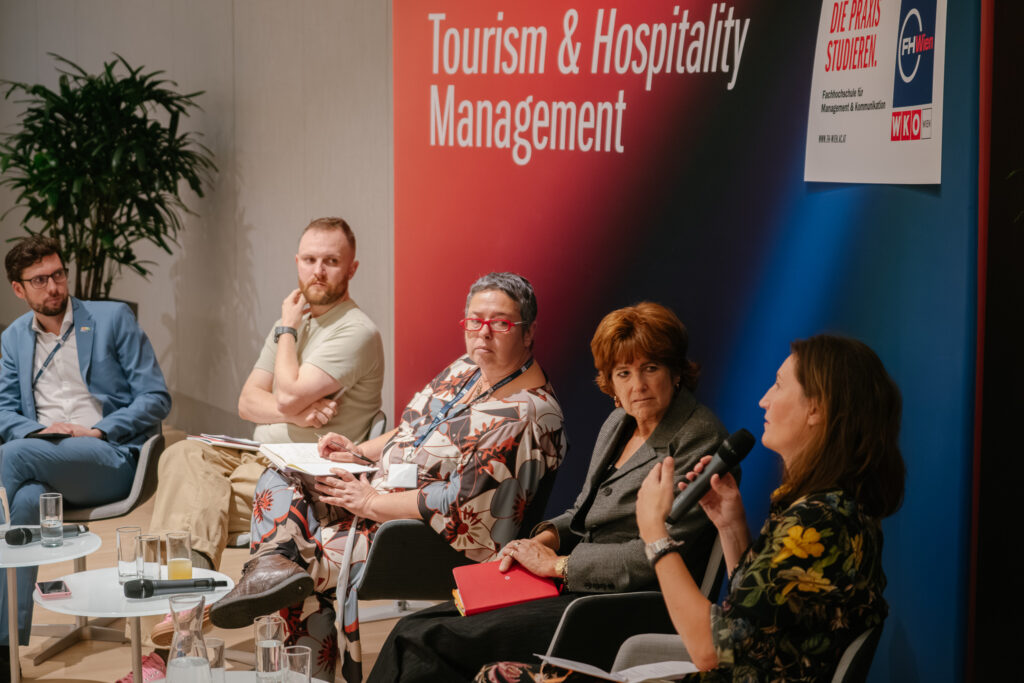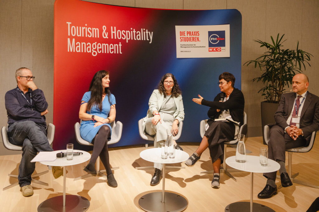 Ein besonderes Highlight bildete die Abschluss-Keynote von Ethan Kent, CEO der internationalen Initiative PlacemakingX. Unter dem Titel Placemaking in Tourism and Urban Development sprach er über die Bedeutung des öffentlichen Raums als Motor für Lebensqualität und soziale Teilhabe. Im anschließenden Gespräch mit Cornelia Dlabaja (FHWien der WKW), Patricia Davies von der Bezirksvertretung Innere Stadt, Katharina Höftberger von UIV (Klima- & Innovationsagentur der Stadt Wien) und Giovanna Marconi von der IUAV Universität Venedig wurde diskutiert, wie Placemaking als Brücke zwischen Stadt- und Tourismusentwicklung wirken kann. Dabei stand die Frage im Zentrum, wie Orte so gestaltet werden können, dass sie sowohl BewohnerInnen als auch BesucherInnen gleichermaßen zugutekommen.