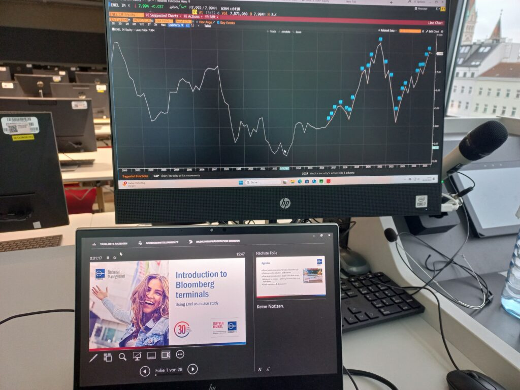 Eine Fallstudie der Lehrveranstaltung wurde durch den Einsatz der Bloomberg Terminals ergänzt. Nach einer Einführung in die Funktionsweise der Terminals recherchierten die Studierenden in Teams Informationen und Daten zu ausgewählten Fragestellungen und machten sich so mit den Recherche- und Analysefunktionen von Bloomberg vertraut. Ein besonderer Mehrwert der Einbindung von Bloomberg Terminals in die Lehrveranstaltung besteht darin, dass relevante Informationen in kurzer Zeit verfügbar sind und unmittelbar in die Diskussion der Fallstudie einfließen können.
