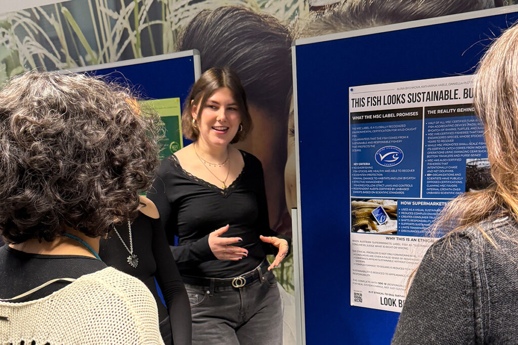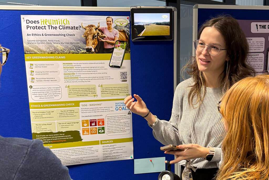 Im Bachelorstudium Kommunikationswirtschaft setzen sich die Studierenden im ersten Semester mit dem Spannungsfeld Nachhaltigkeitskommunikation versus Greenwashing auseinander. In der Lehrveranstaltung „Internal Communications & Ethics“ (Modul Organizational Communication & Ethics) analysieren sie Werbe- und Kommunikationsmaßnahmen von Unternehmen im Hinblick auf Authentizität und Transparenz. Am SDG Day 2026 präsentierten die Studierenden ihre Ergebnisse in Posterpräsentationen.