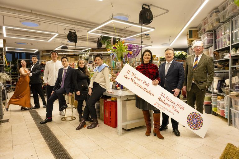 Im Bild: (v.l.) Tangotanzpaar Nataliia Kozak und Gencay Aslan, Ballbotschafter Jing Chen, Stargast und Ig-Nobel-Preisträger Fabrizio Olmeda, die Ballbotschafterinnen Elka Xharo und Amira Ben Saoud, Wissenschaftsstadträtin Veronica Kaup-Hasler, Bürgermeister Michael Ludwig sowie Ballorganisator Oliver Lehmann.