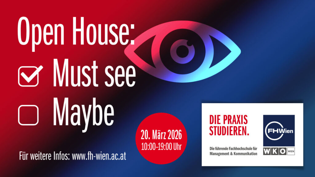 Am Freitag, 20. März 2026, findet von 10:00 bis 19:00 Uhr wieder das Open House der FHWien der WKW statt. An unserem Tag der offenen Tür können sich InteressentInnen und BewerberInnen über das Studienangebot informieren, sich Tipps zum Aufnahmeverfahren holen, den Campus erkunden u. v. m.